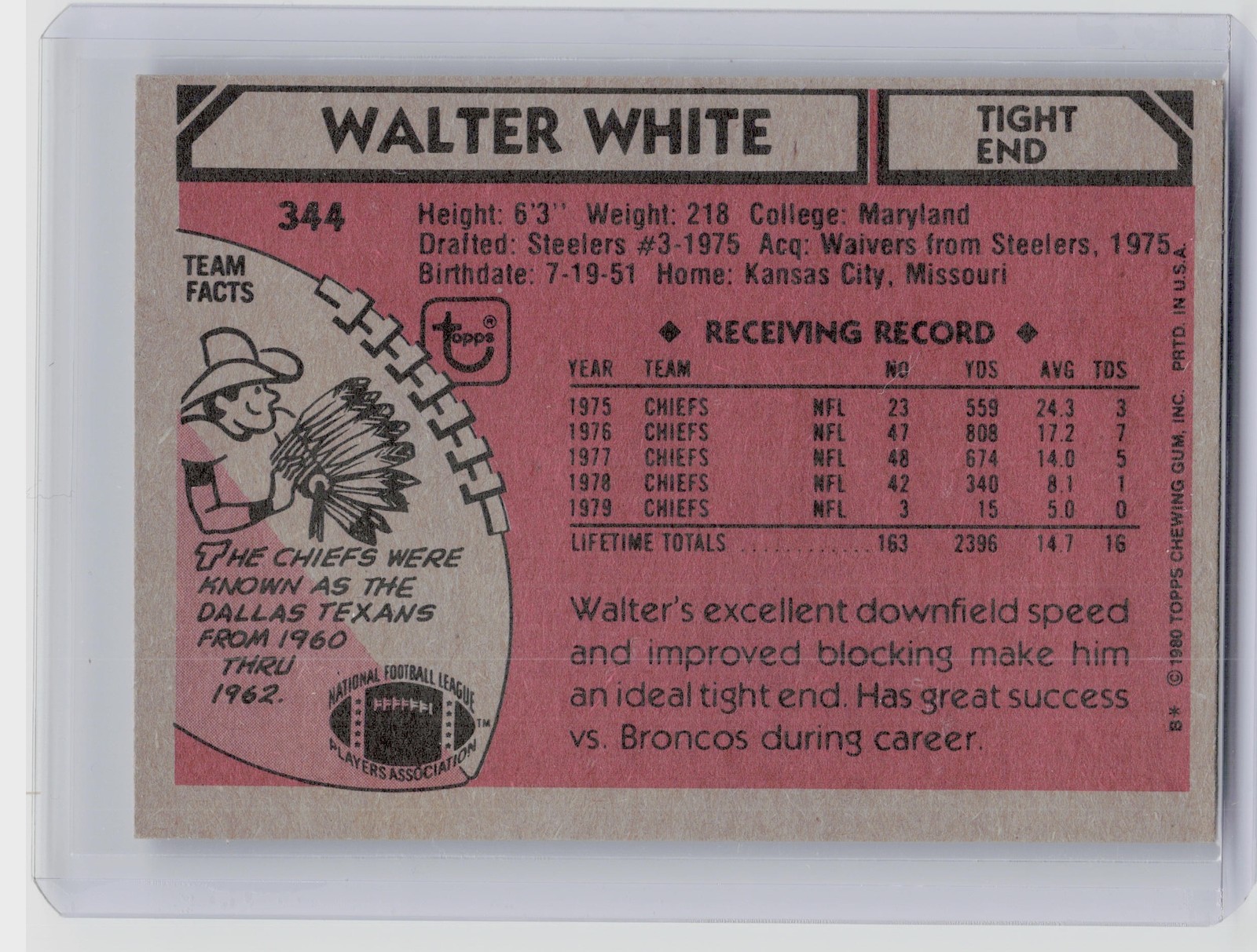 1980 Topps Walter White #344 Chiefs