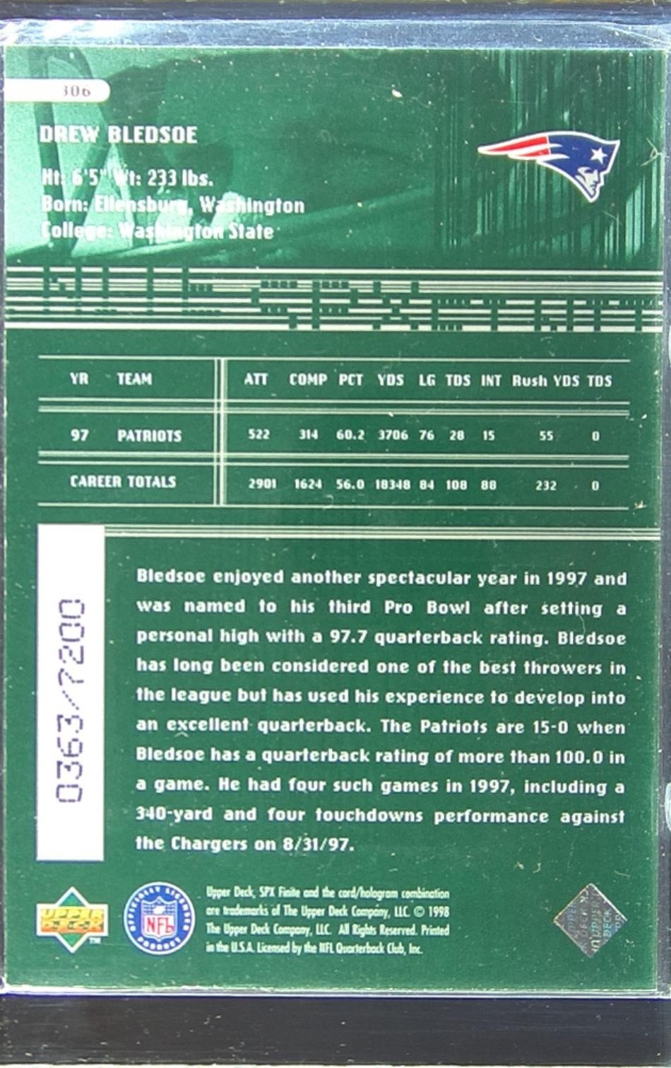 1998 SPx Finite Drew Bledsoe /7200 #306 Patriots