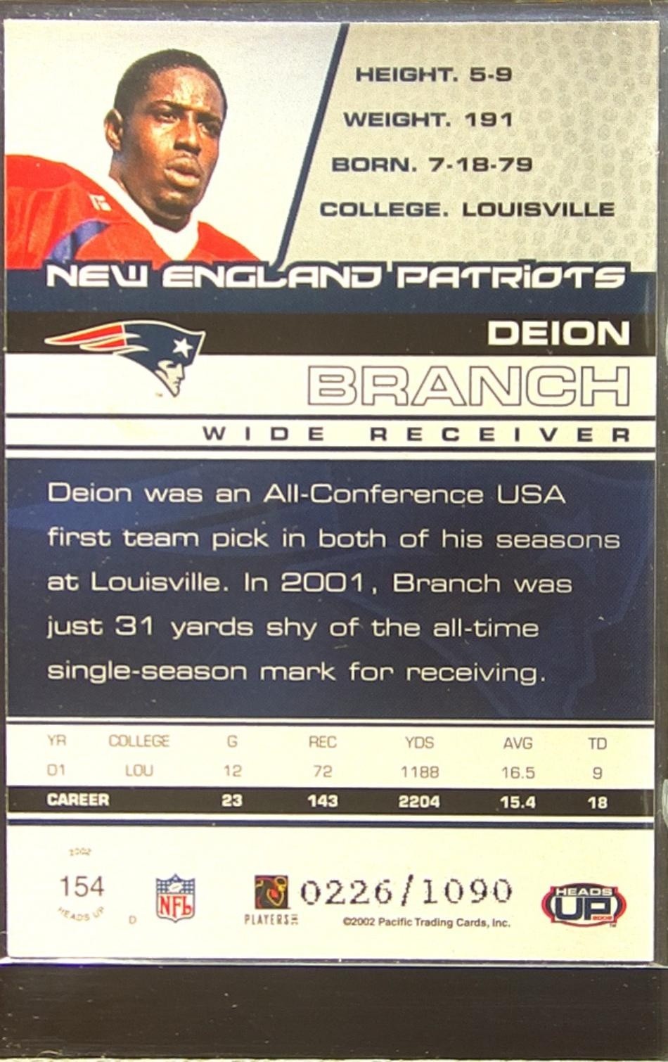 2002 Pacific Heads Up Deion Branch RC /1090 #154 Patriots