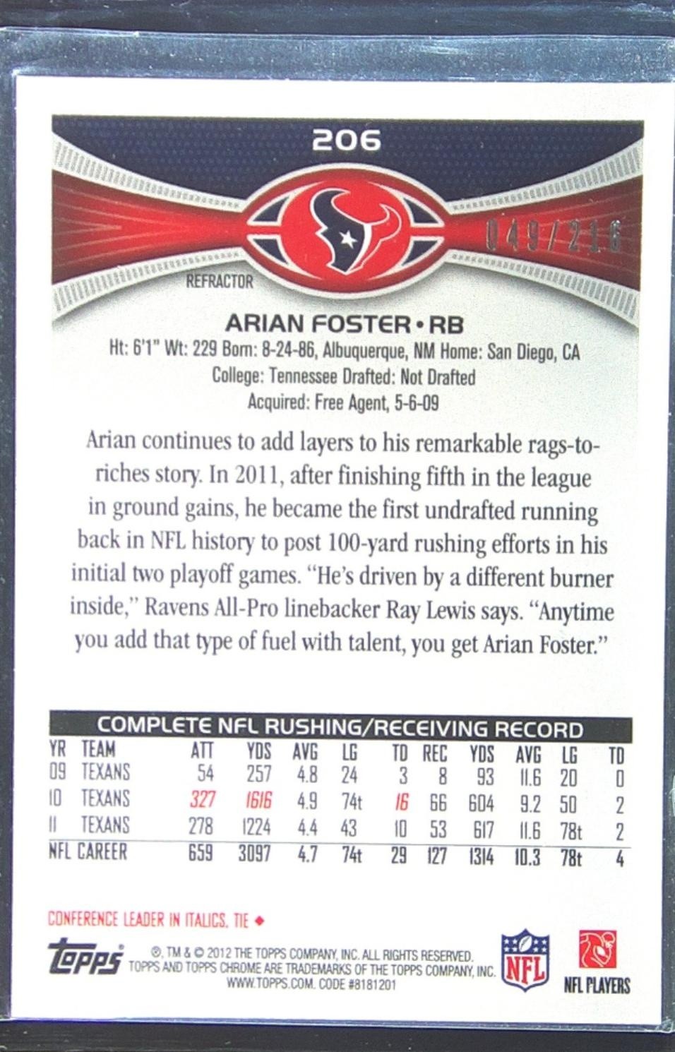 2012 Topps Chrome Arian Foster Prism Refractors /216 #206 Texans