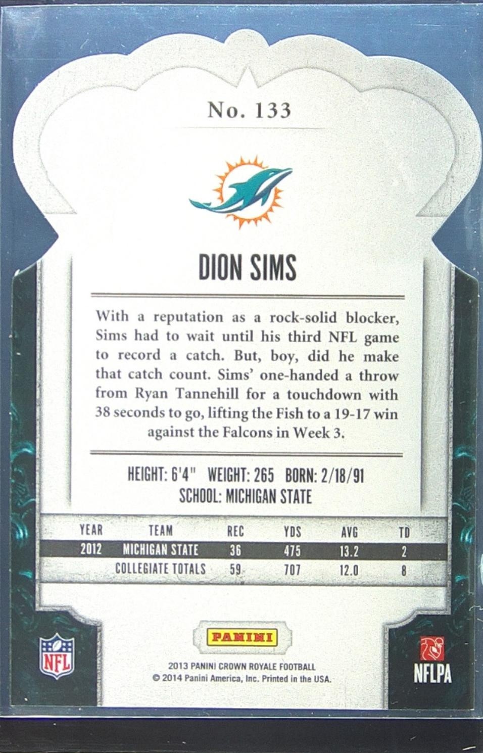 2013 Crown Royale Dion Sims Bronze (Die Cut Crown) RC #133 Dolphins