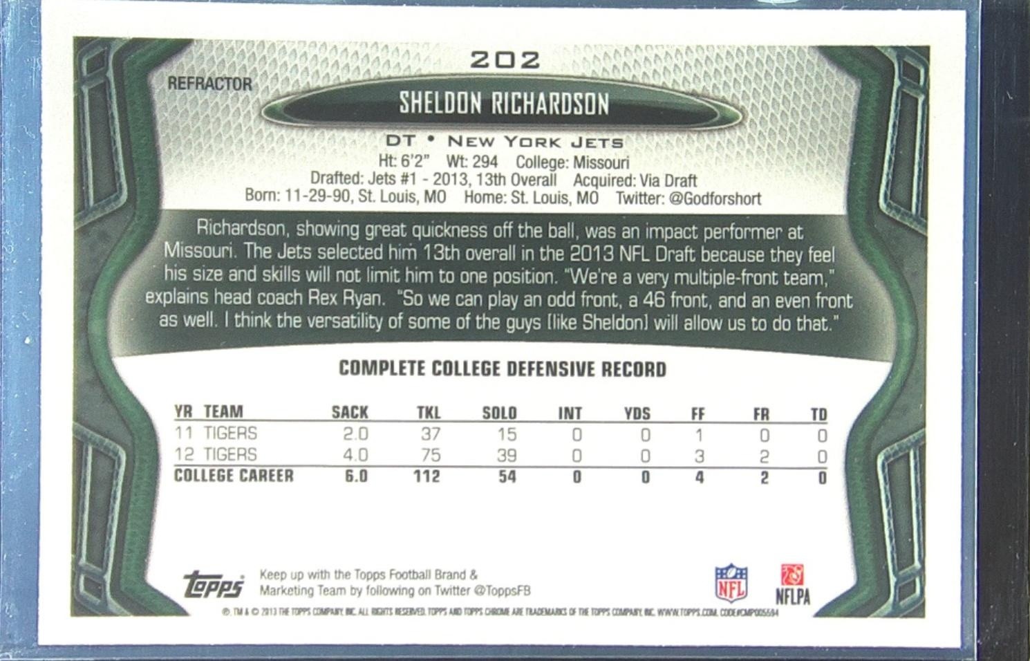 2013 Topps Chrome Sheldon Richardson Blue Wave Refractors RC #202 Jets