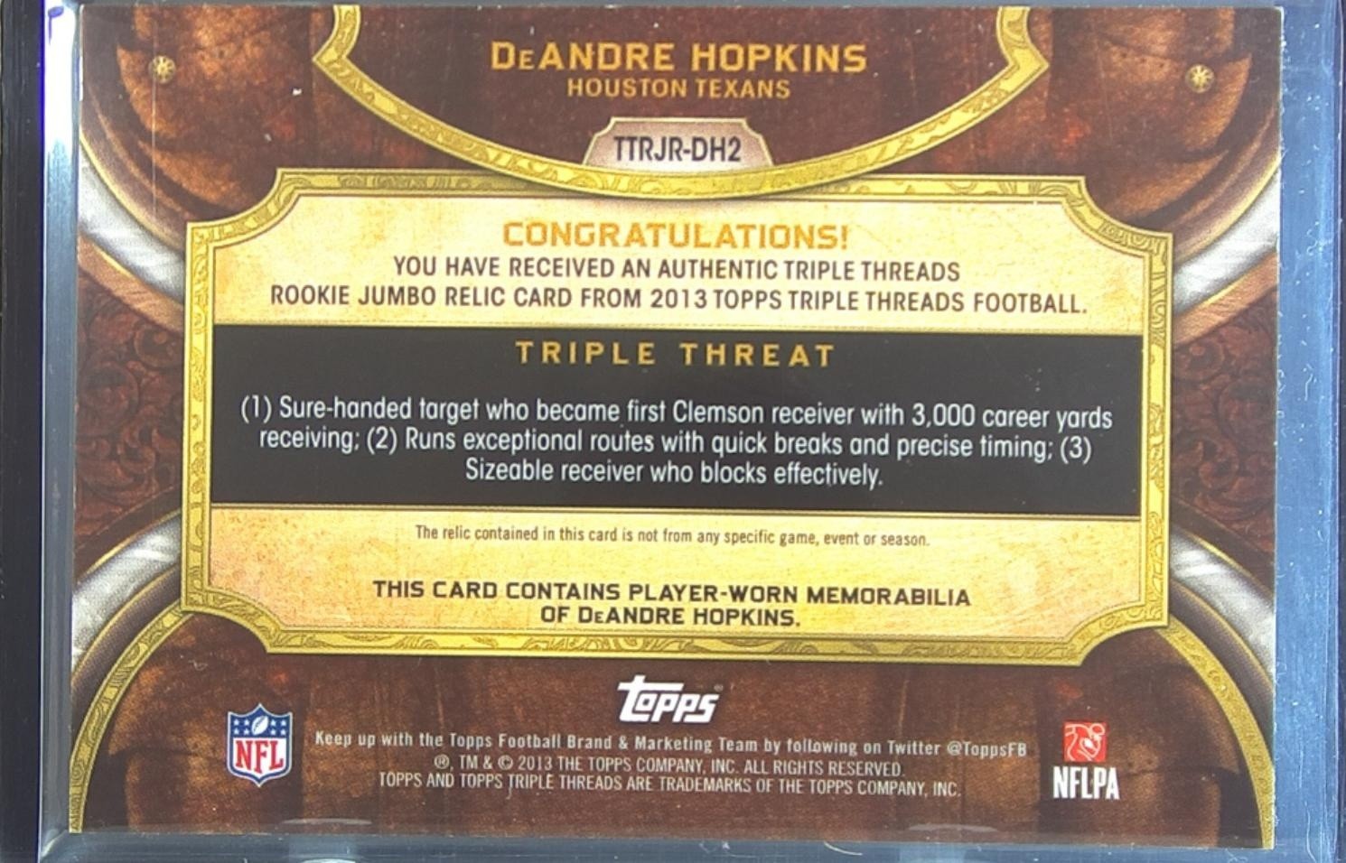 2013 Triple Threads DeAndre Hopkins /99 JSY #TTRJR-DH2 Texans Rookie Jumbo Relic