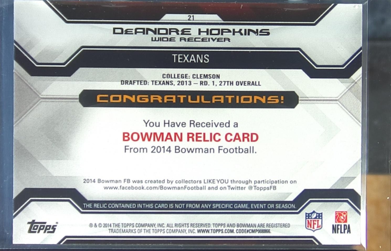 2014 Bowman DeAndre Hopkins /50 JSY #21 Texans Relics Gold