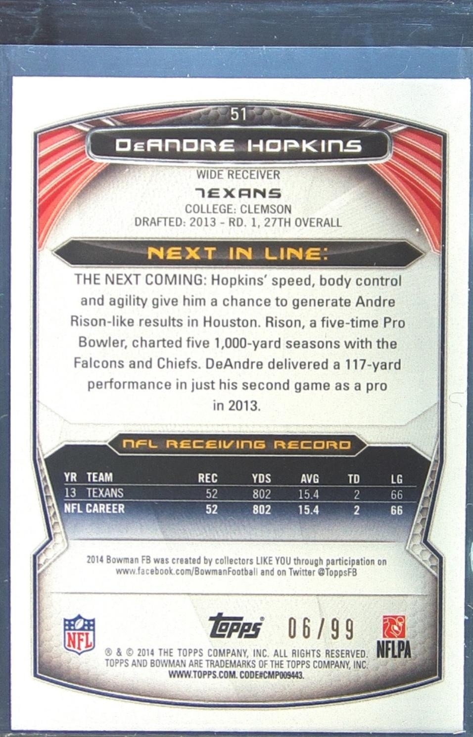 2014 Bowman DeAndre Hopkins Veterans Rainbow Blue /99 #51 Texans