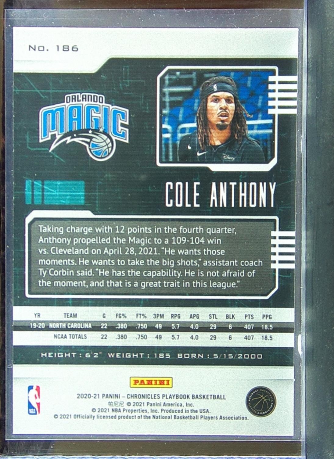 2020-21 Chronicles Cole Anthony Teal RC #186 Magic