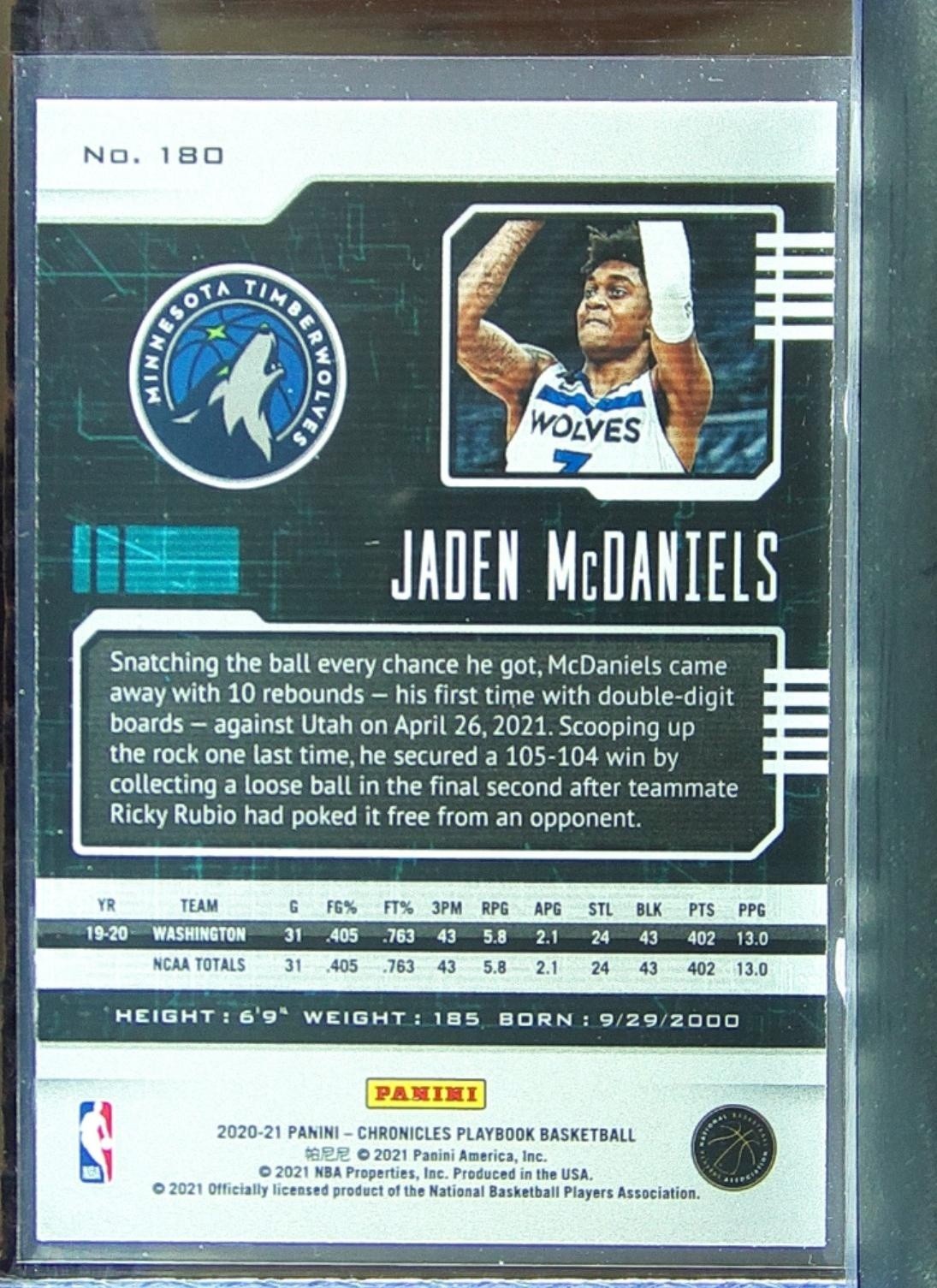 2020-21 Chronicles Jaden McDaniels Teal RC #180 Timberwolves