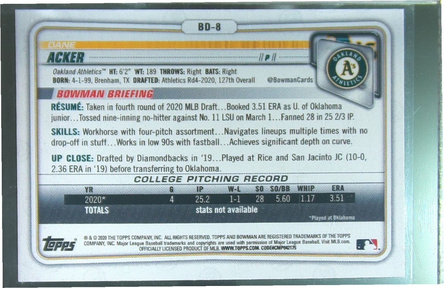 2020 Bowman Draft Dane Acker Purple /250 #BD-8 Athletics