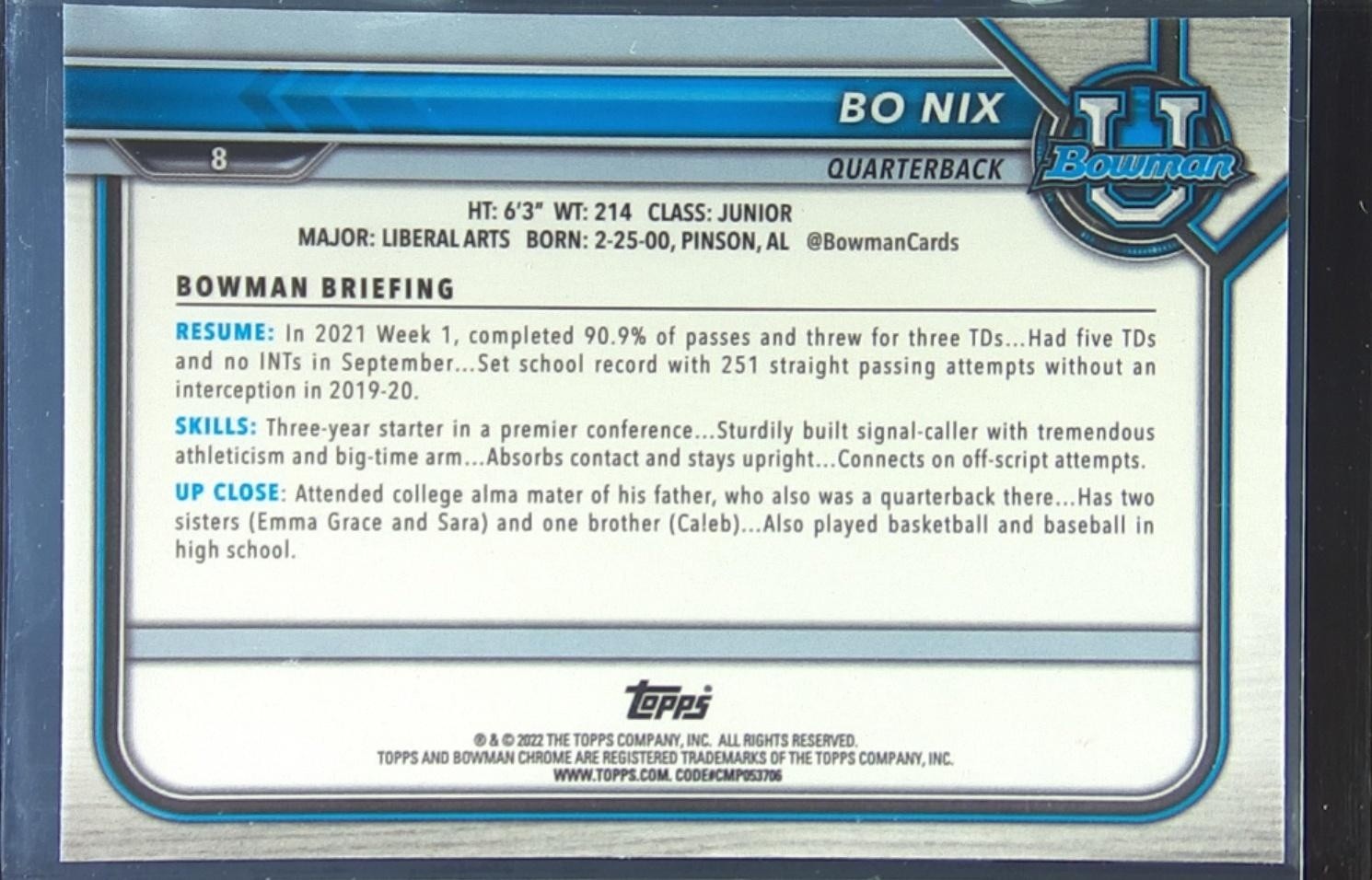 2021 Bowman University Bo Nix Chrome Refractors #8 Tigers First