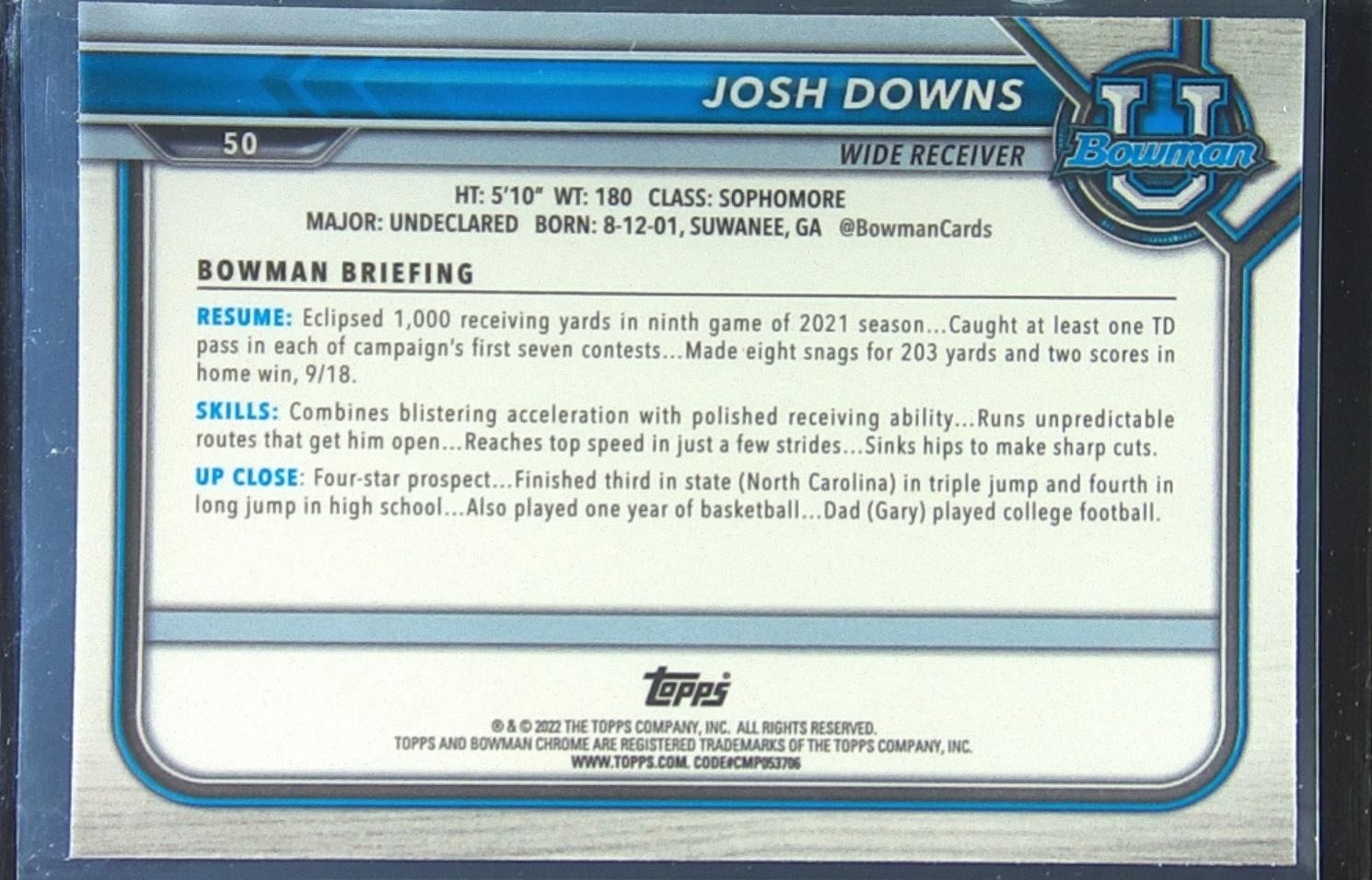 2021 Bowman University Josh Downs Chrome Pink #50 Heels
