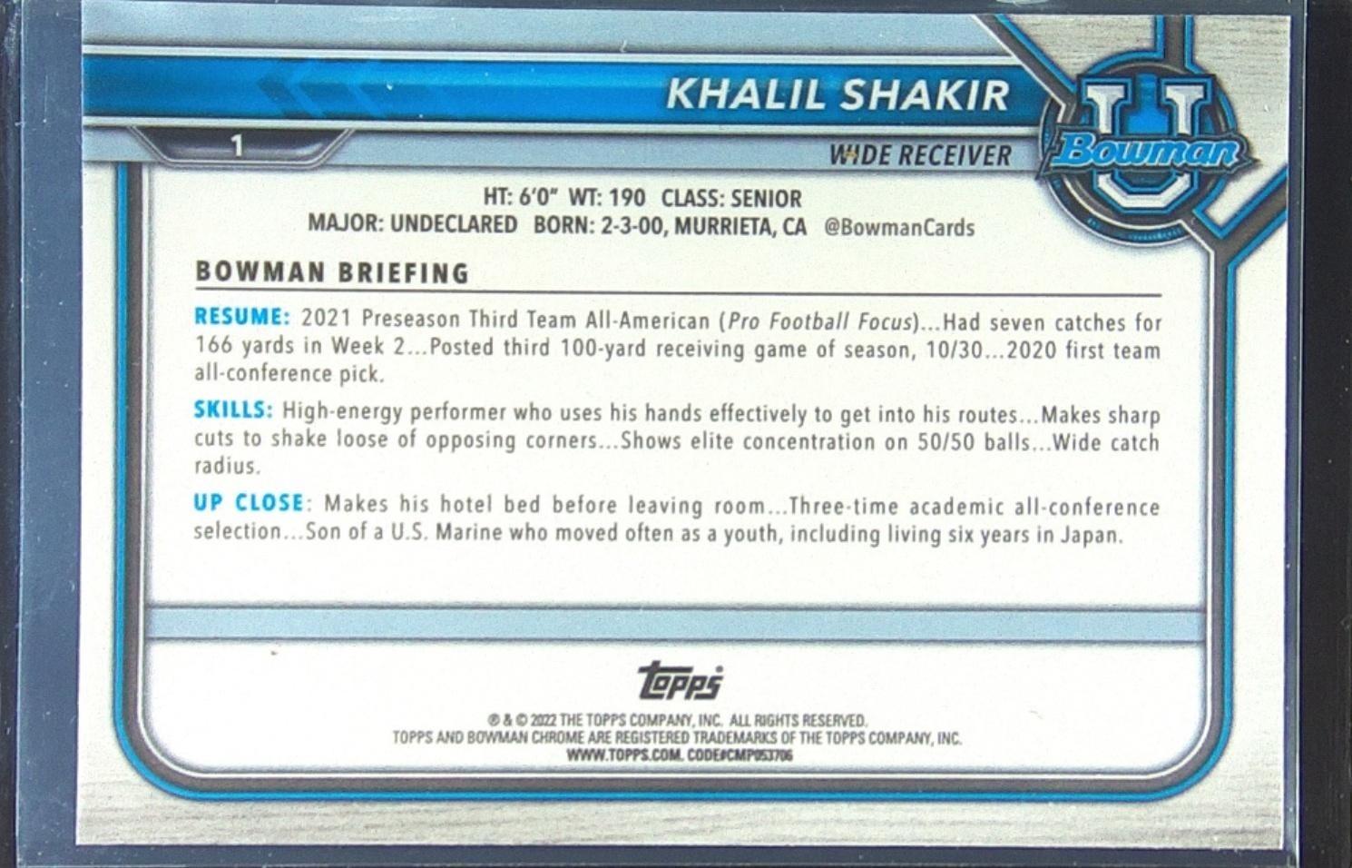 2021 Bowman University Khalil Shakir Chrome Pink #1 Broncos First Bowman