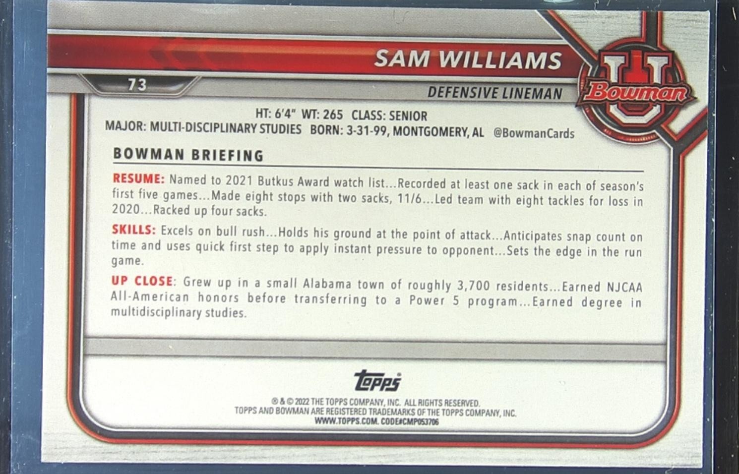 2021 Bowman University Sam Williams #73 Rebels First Bowman