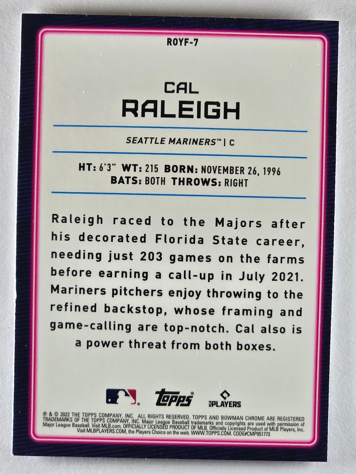 2022 Bowman Chrome Cal Raleigh Rookie of the Year Favorites RC #ROYF-7