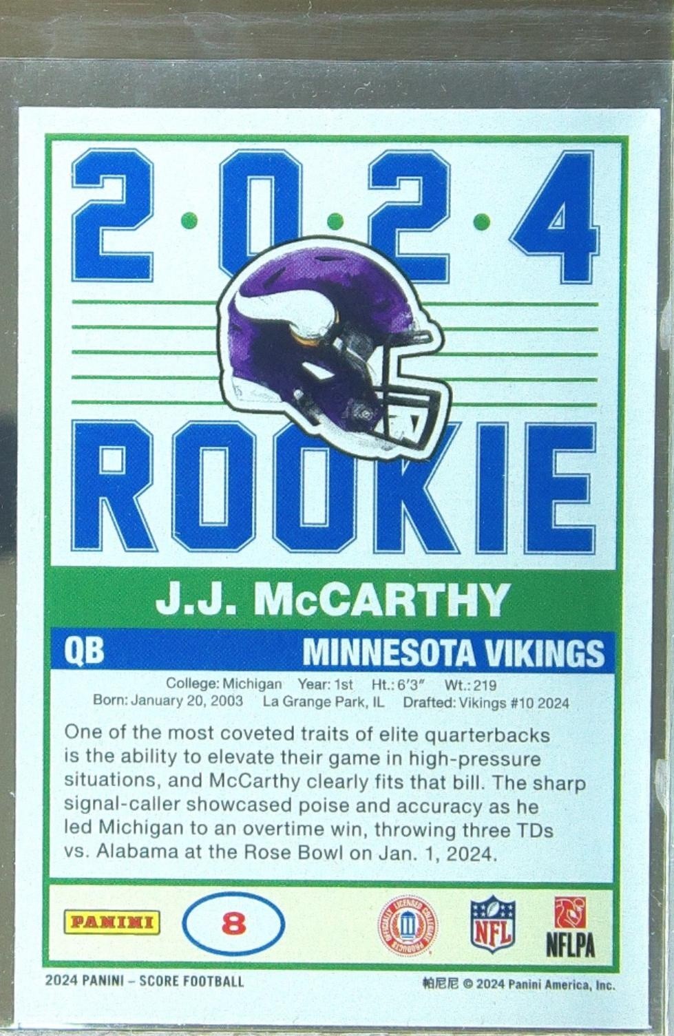 2024 Score J.J. McCarthy RC #8 Vikings 35th Anniversary Rookies