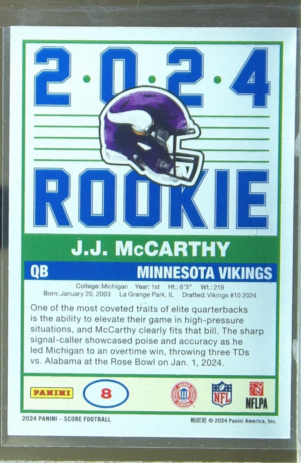 2024 Score J.J. McCarthy RC #8 Vikings 35th Anniversary Rookies