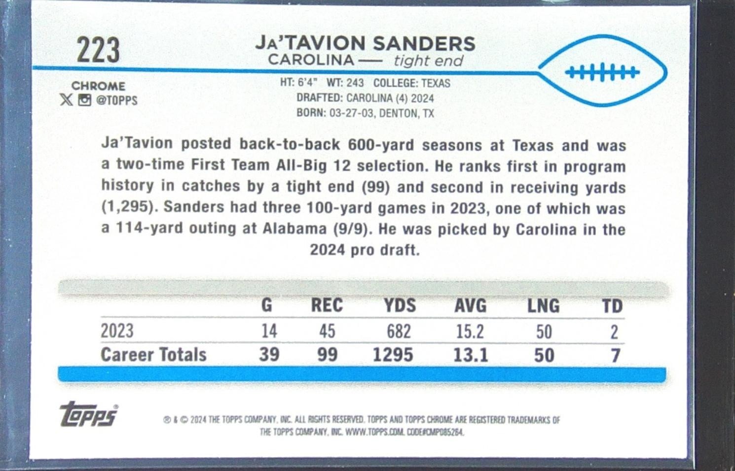 2024 Topps Chrome Ja'Tavion Sanders Refractor #223 Panthers