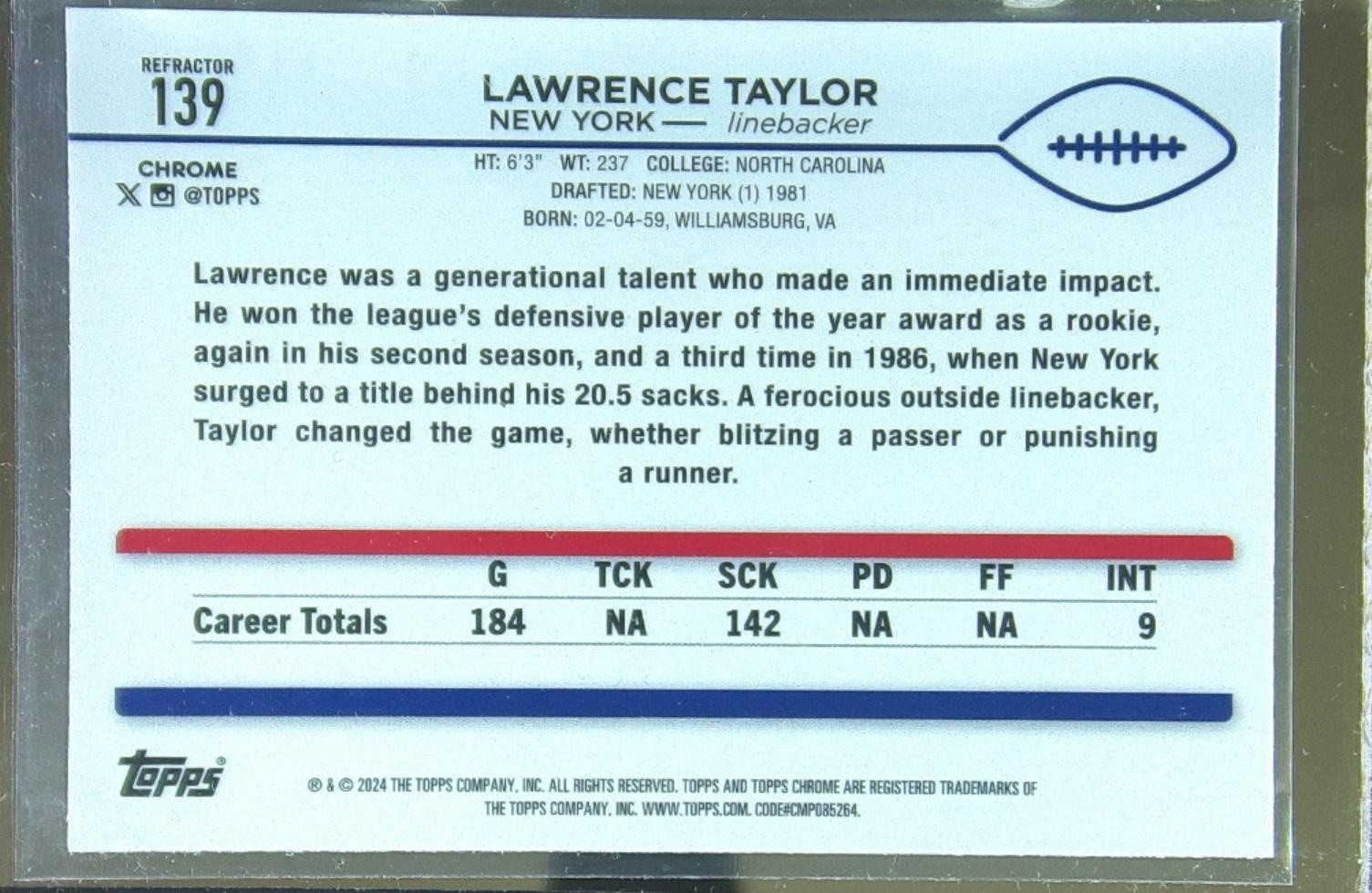 2024 Topps Chrome Lawrence Taylor Refractor #139 Giants