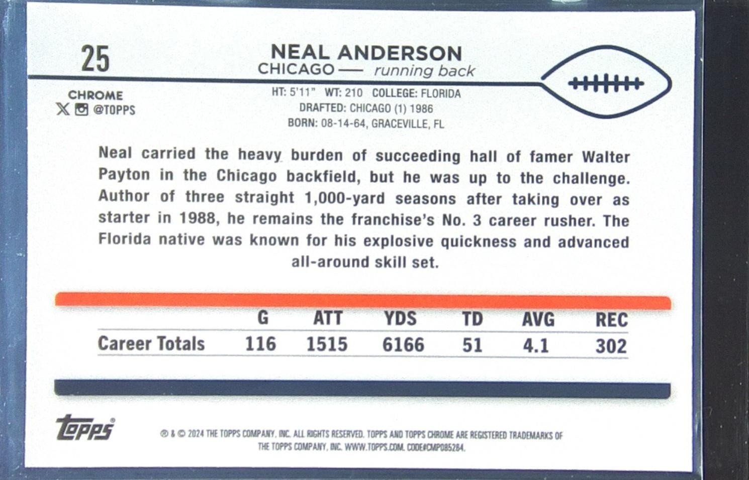 2024 Topps Chrome Neal Anderson Sepia Refractor #25 Bears