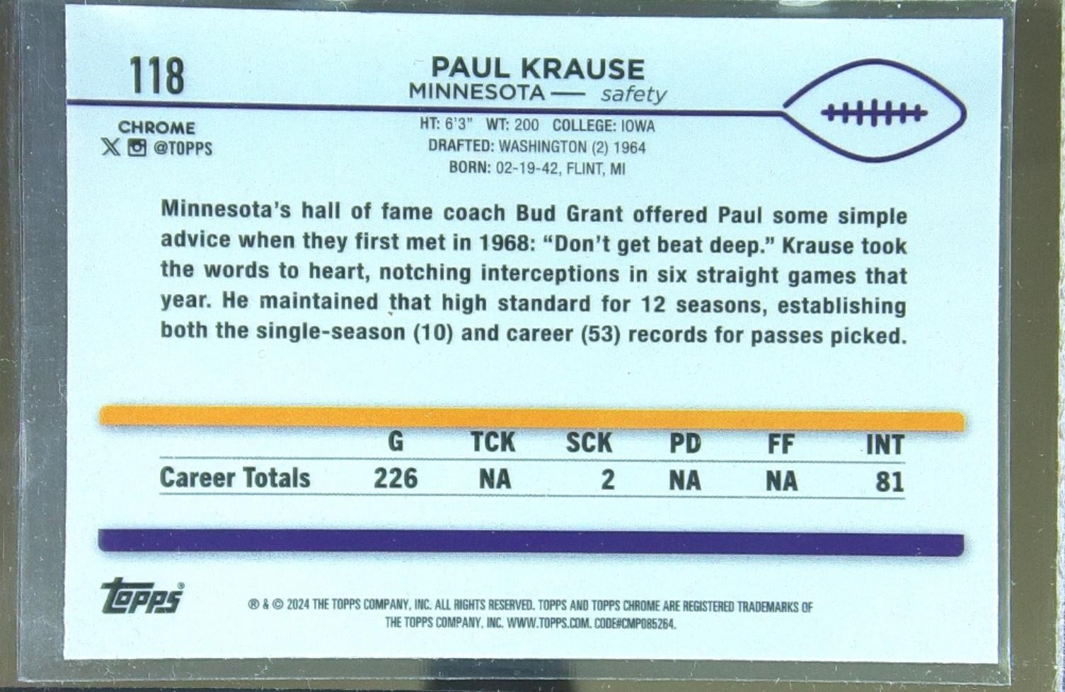 2024 Topps Chrome Paul Krause Prism Refractor #118 Vikings