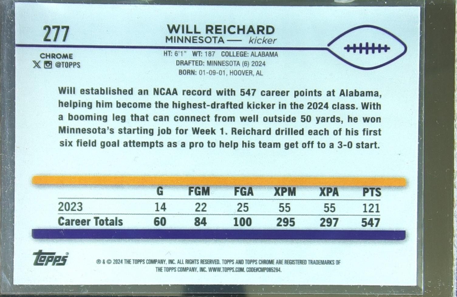 2024 Topps Chrome Will Reichard RC #277 Vikings