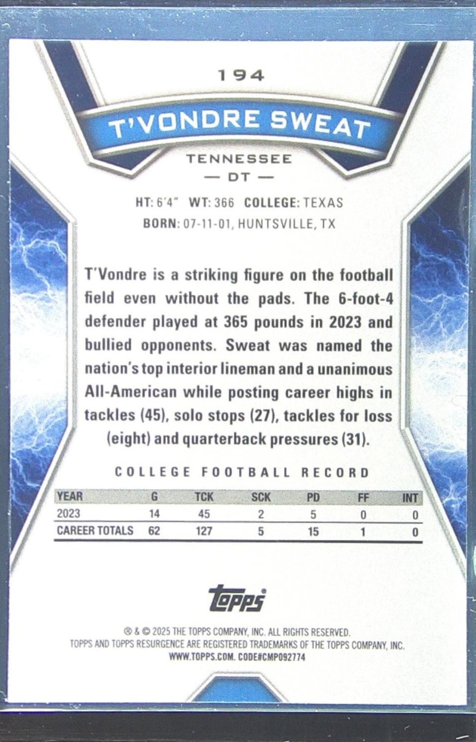 2024 Topps Resurgence T'Vondre Sweat RC #194 Titans