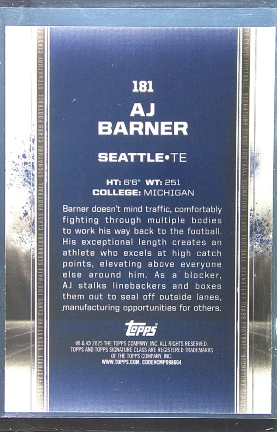 2024 Topps Signature Class AJ Barner RC #181 Seahawks