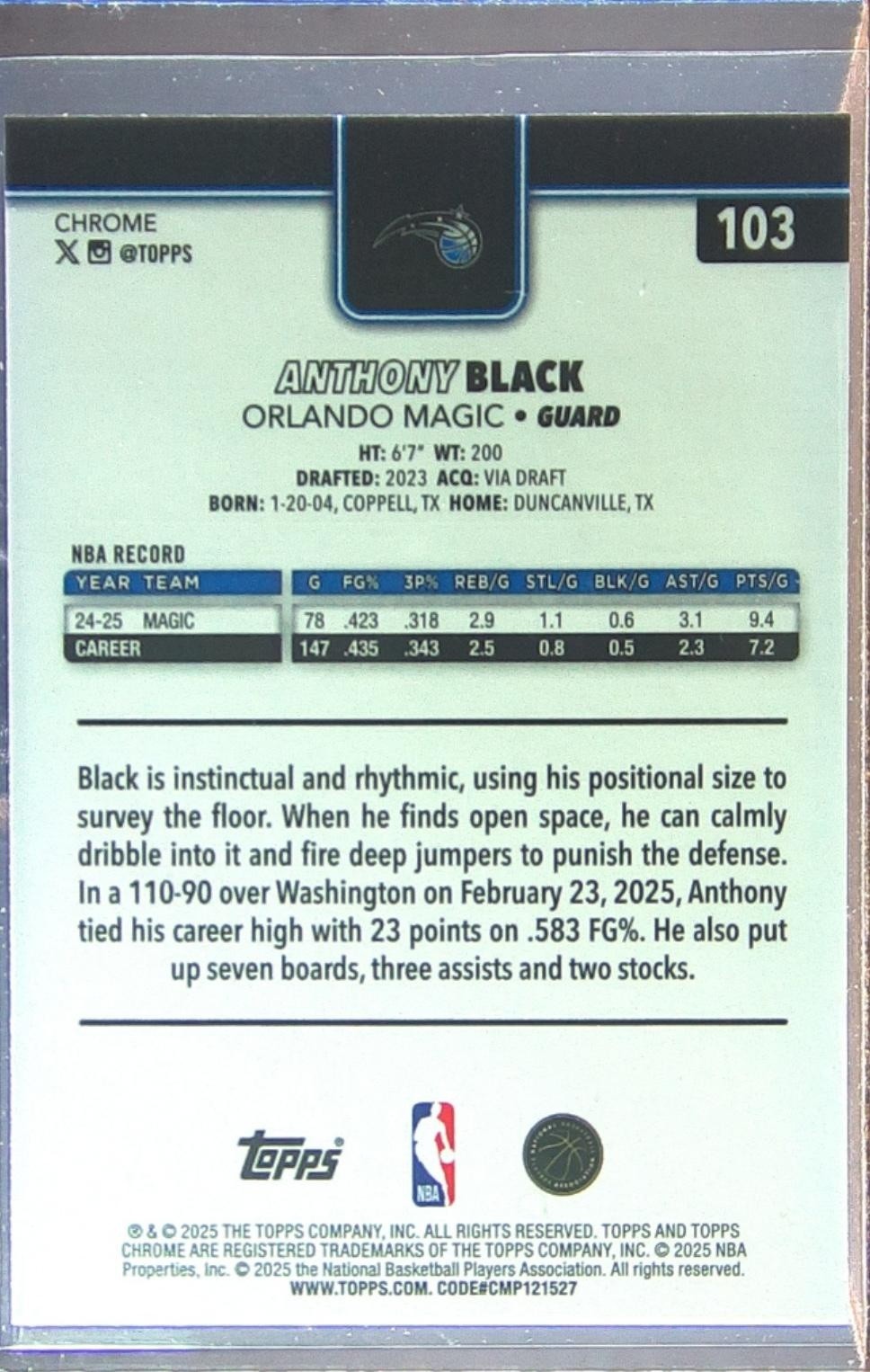 2025-26 Topps Chrome Anthony Black X Fractor #103 Magic
