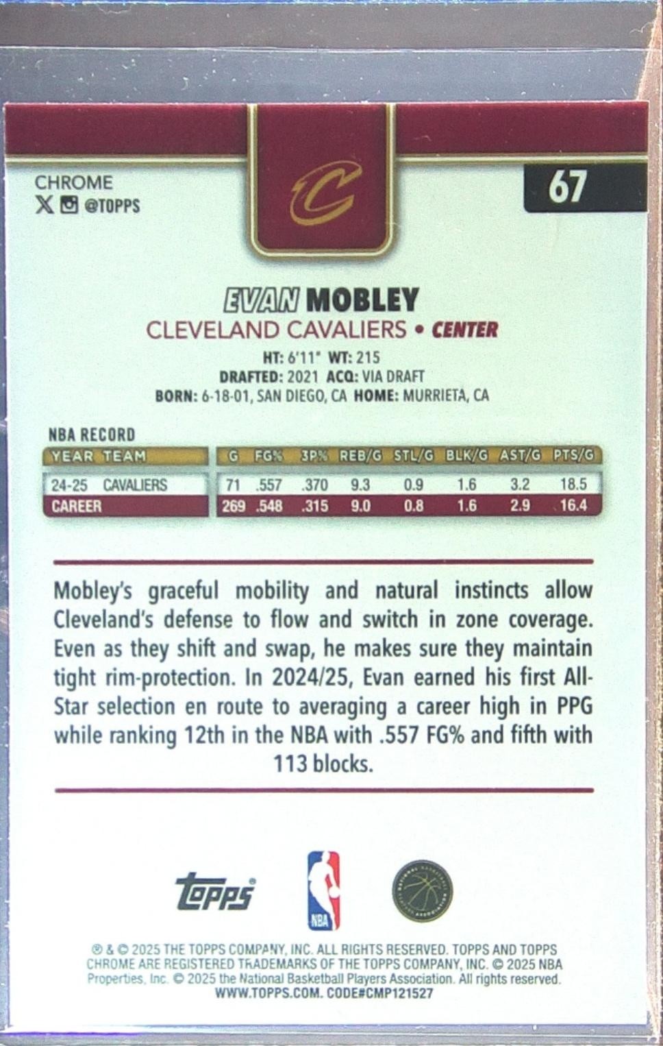 2025-26 Topps Chrome Evan Mobley Prism Refractor #67 Cavaliers