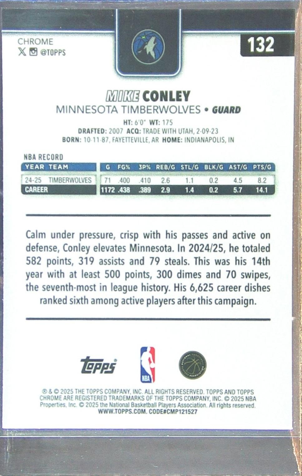2025-26 Topps Chrome Mike Conley RayWave Refractor #132 Timberwolves